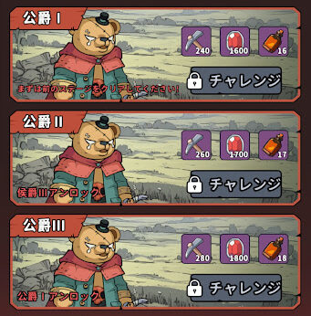 | 公爵 I | ツルハシ×240 | 契約石×1600 | 秘酒×16 | |